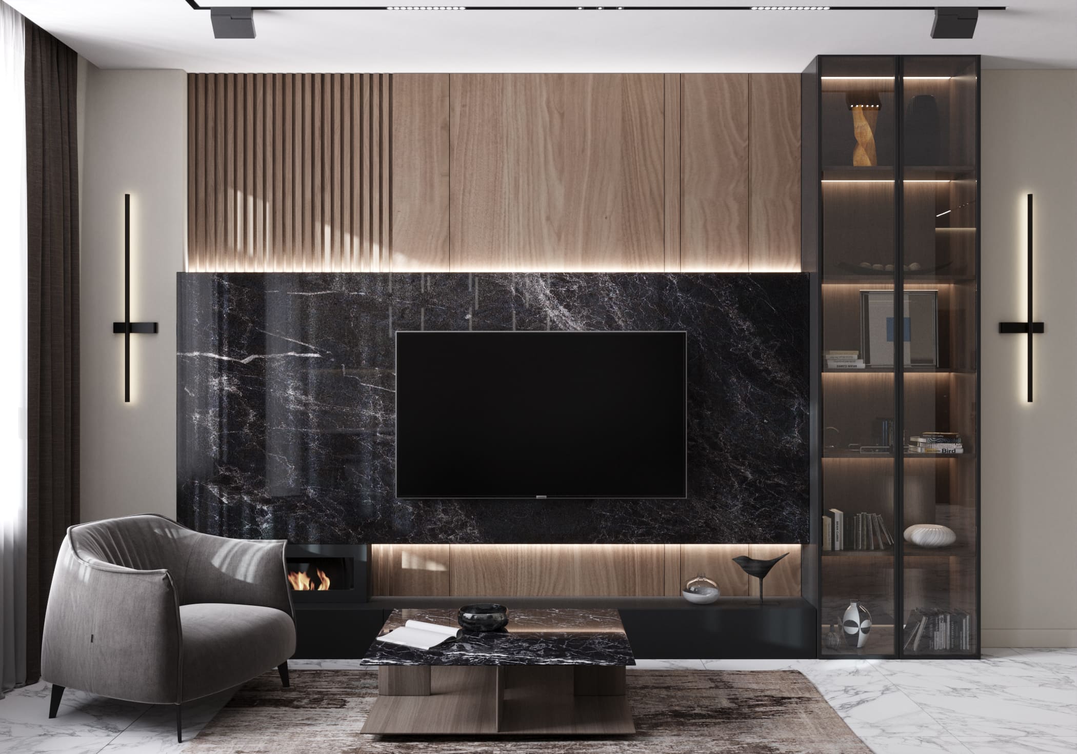 В гостиной зоне мы смягчили интерьер деревянными панелями, светлым серым диваном и уютным креслом. Зона за TV и журнальный столик с поверхностью под тёмный мрамор перекликаются с кухонными поверхностями. Вертикальные панели из светлого дерева на фоне облицовки из чёрного мрамора визуально вытягивают пространство и вносят природное тепло. Акцентная люстра также добавляет геометрии, а разные сценарии освещения завершают образ, создавая сбалансированное освещение.