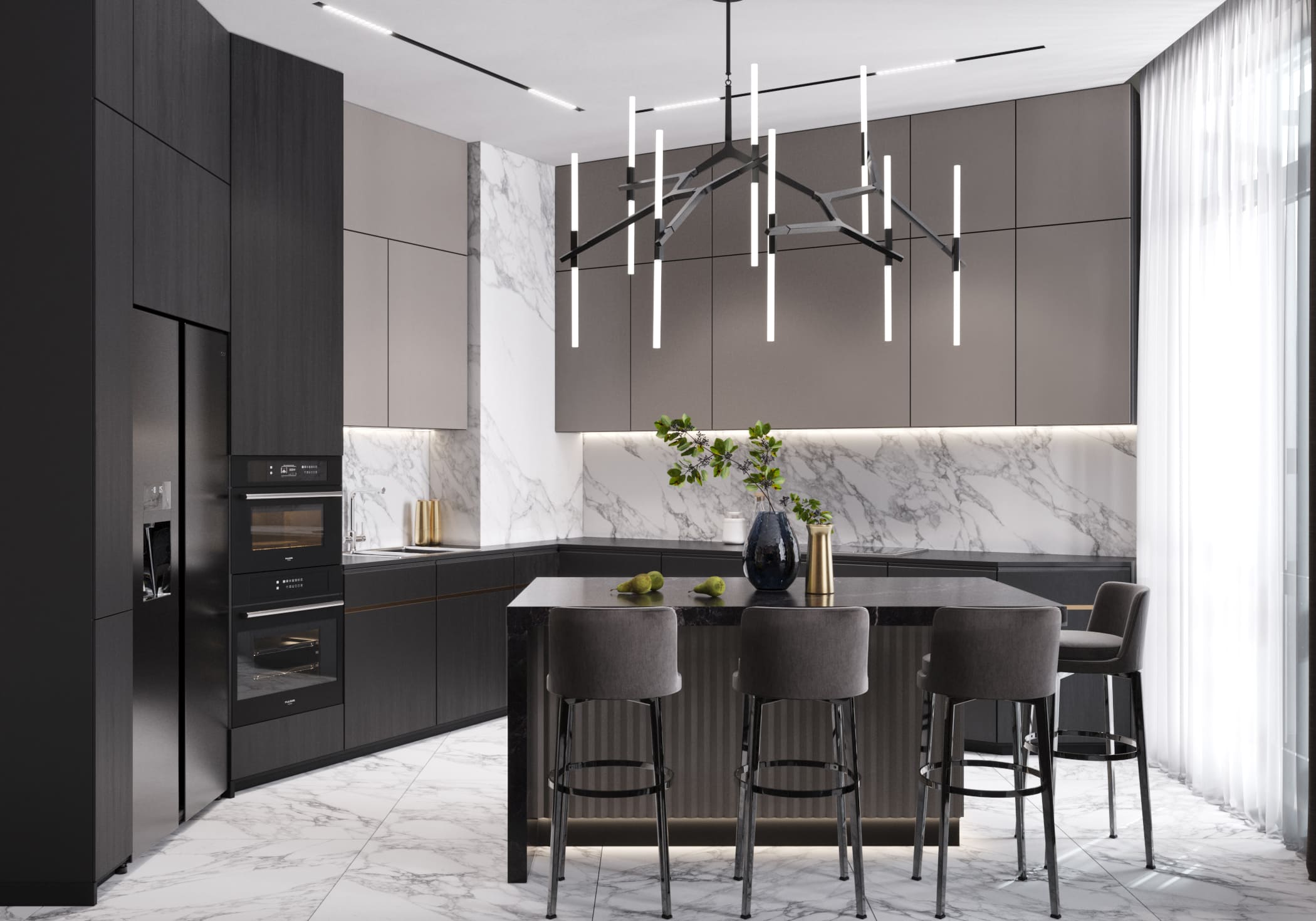 В этом проекте кухня-гостиная строится на контрасте тёмного и светлого. Кухонная зона выполнена в монохромных тонах: тёмные фасады шкафов и рабочая поверхность из чёрного мрамора в сочетании с тёмным островом с мраморной столешницей. Верхние шкафы бежевого оттенка и фартук из белой плитки под мрамор разбавляют интерьер, добавляя в него воздуха и лёгкости. Чёрная встроенная бытовая техника очень стильно встроена в общую концепцию.