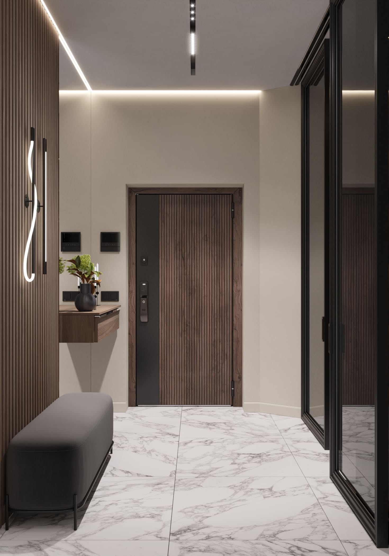 Прихожая получилась стильной и функциональной. Сделали акцент на стену с деревянными панелями, рядом с которой разместили мягкий пуф, зеркало во весь рост и навесную тумбу: здесь удобно собираться перед выходом, а зеркало визуально расширяет пространство. С другой стороны установили вместительный шкаф с дверцами из тонированного стекла — он добавляет глубины интерьеру и решает все задачи по хранению. Пол выложили светлой плиткой под мрамор, а освещение сделали комбинированным: настенные бра и встроенные потолочные светильники дают мягкий равномерный свет без лишних теней.