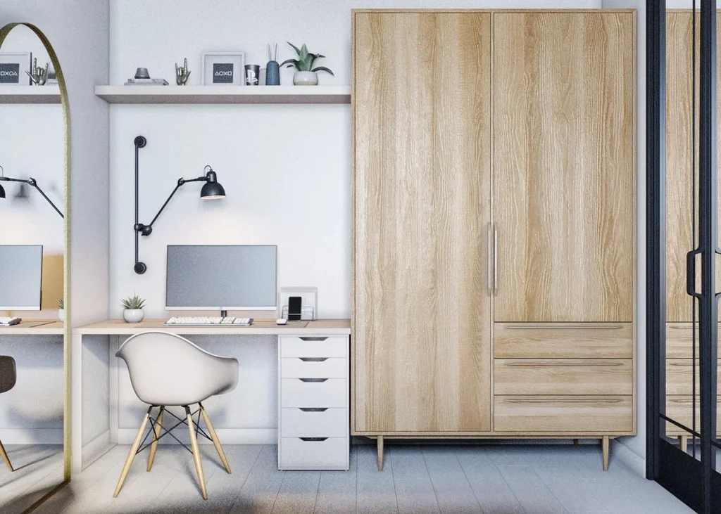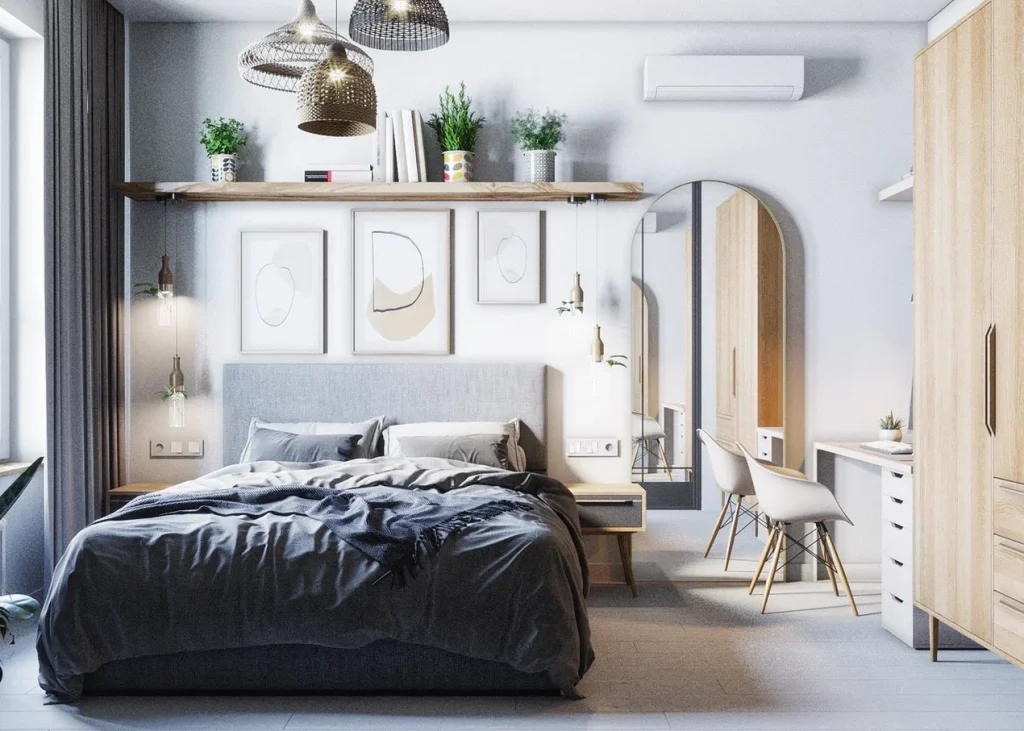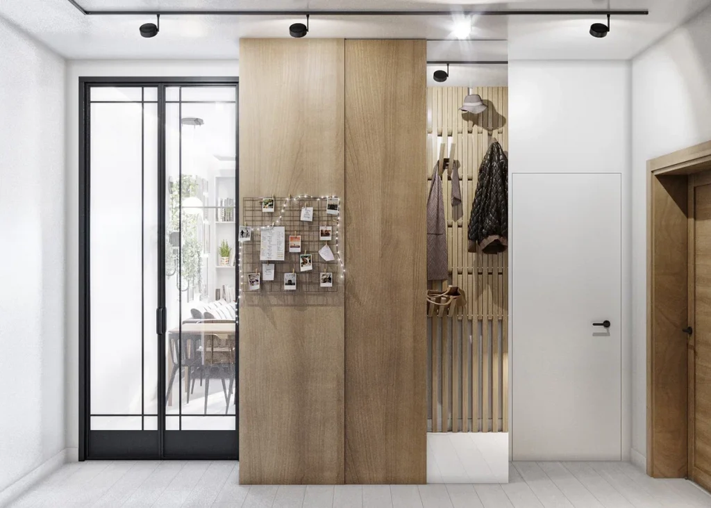 Квартира для молодой семьи в скандинавском стиле с элементами бохо стиля, с прихожей, кухней-гостиной, мастер-спальней, кабинетом, ванной и санузлом