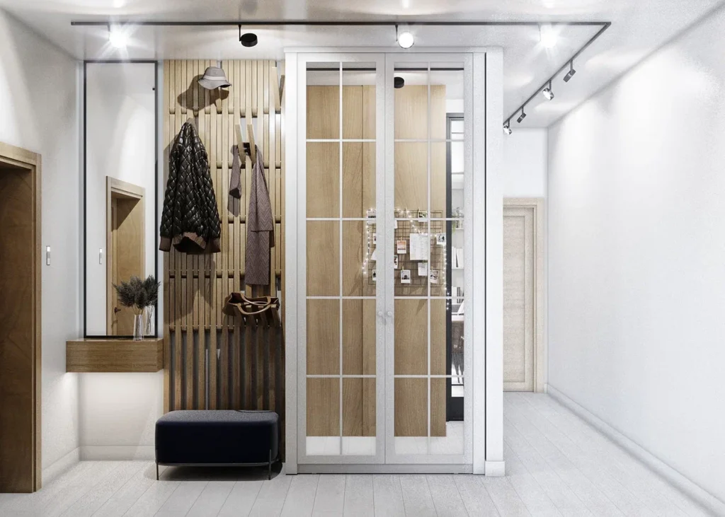Прихожая выглядит просторно, панорамные высокие стеклянные двери в гостиную и смежную с гостиной спальню добавили помещениям объема и света. В качестве напольного покрытия выбран spc-ламинат – экологичный и практичный материал, который уложен единым полотном без порогов во всей квартире, включая санузлы.