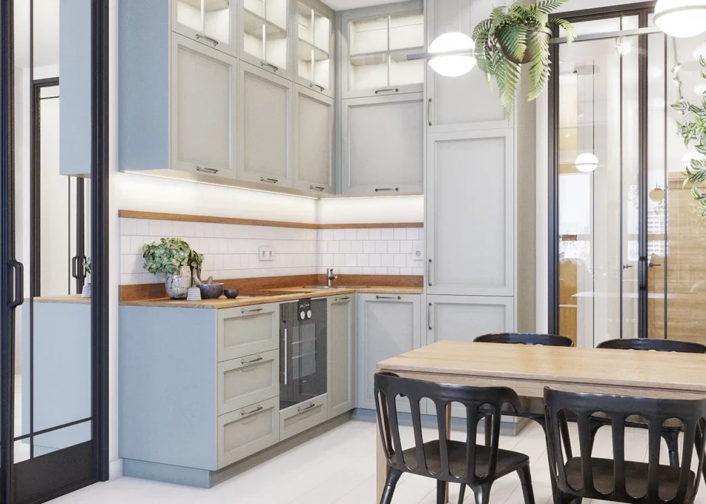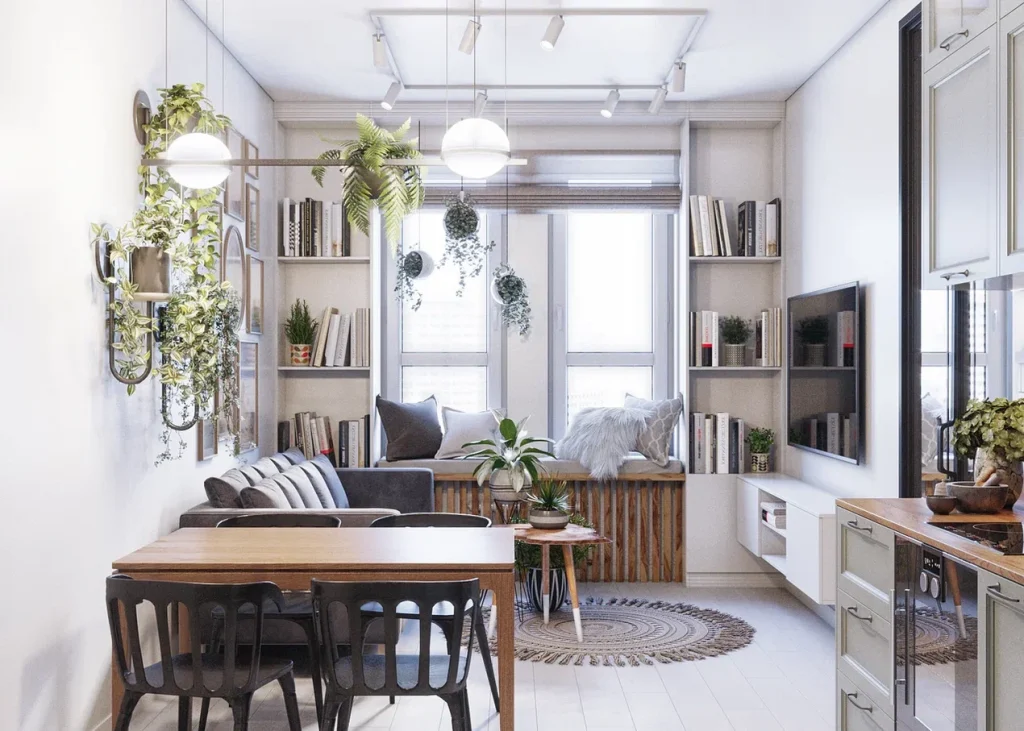 Светлый интерьер смотрится уютным, благодаря большому количеству растений и текстуре дерева в мебели, которые служат акцентами на практически белом фоне. Растения присутствуют в каждой из комнат и даже в подвесных светильниках. Интерьер получился очень современным за счет интересных решений в виде дверей-невидимок под покраску и теневого профиля вместо плинтуса, а также встроенных светильников на магнитном шинопроводе и встроенной корпусной мебели, выполненной под заказ. В кухне-гостиной окно обыграно большим подоконником, который служит также дополнительным местом для отдыха и чтения книг.