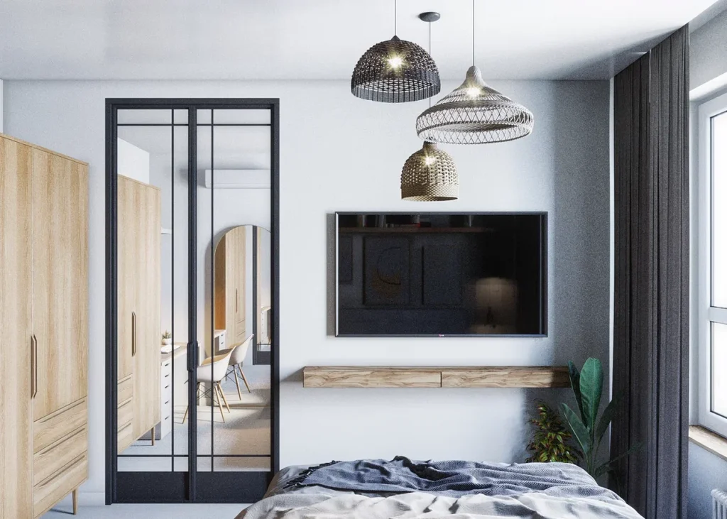 В спальне для дверей выбрано зеркальное остекление для сохранения уединенности пространства. Помимо законного спального места здесь предусмотрено небольшое рабочее место, зона для TV и большой вместительный шкаф.