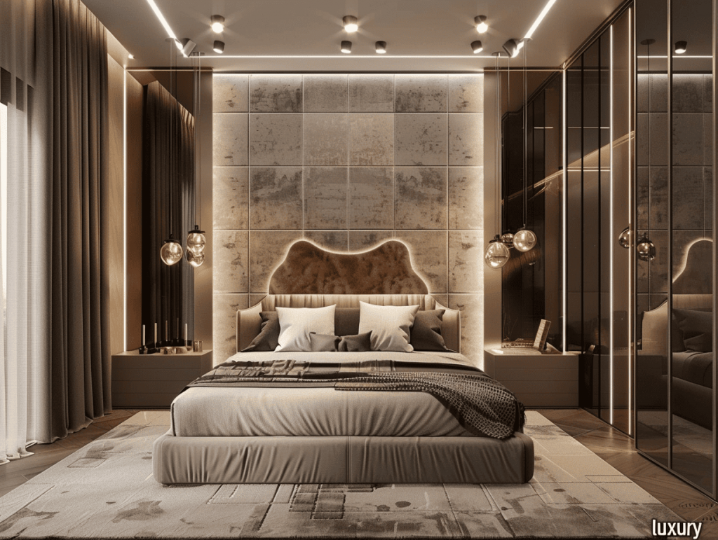 Центральное место спальни заказчиков занимает кровать с мягким изголовьем, которое выделено декоративной подсветкой, создающей атмосферу уюта и визуально разделяющей зону сна. Стена за кроватью отделана панелями с эффектом состаренного металла, что добавляет текстурности и оригинальности. По обе стороны от кровати расположены компактные прикроватные тумбы с подвесными светильниками, которые обеспечивают локальное освещение и освобождают поверхность от лишних деталей.