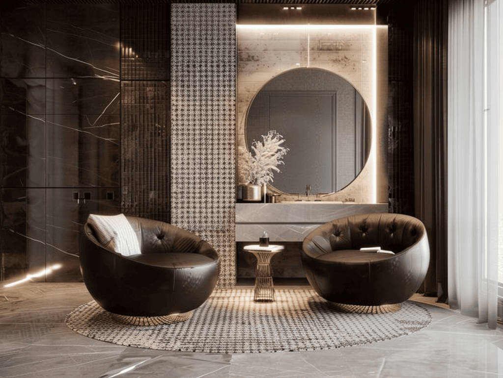 В зоне отдыха, смежной со спальней, расположены два округлых кресла с глубокими сиденьями, обеспечивающие комфорт для чтения или отдыха. Между креслами установлен компактный столик, идеальный для чашки кофе или небольших предметов. Большое круглое зеркало с подсветкой и консольный столик подчёркивают стильную и функциональную составляющую зоны.