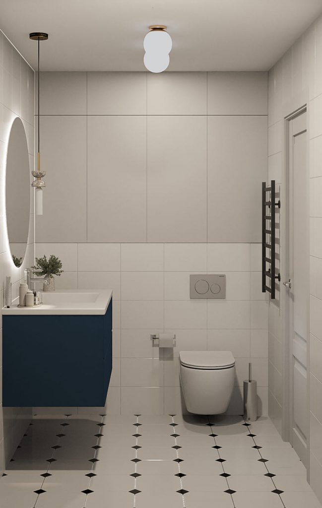 Навесная тумба глубокого синего оттенка с рельефными фасадами — главный акцент этого пространства. Она не только функциональна, но и создаёт насыщенный цветовой контраст на фоне светлой плитки. Подвесной светильник с латунными элементами и круглое зеркало с подсветкой добавляют утончённости, мягкого света и немного «отеля» в хорошем смысле слова.