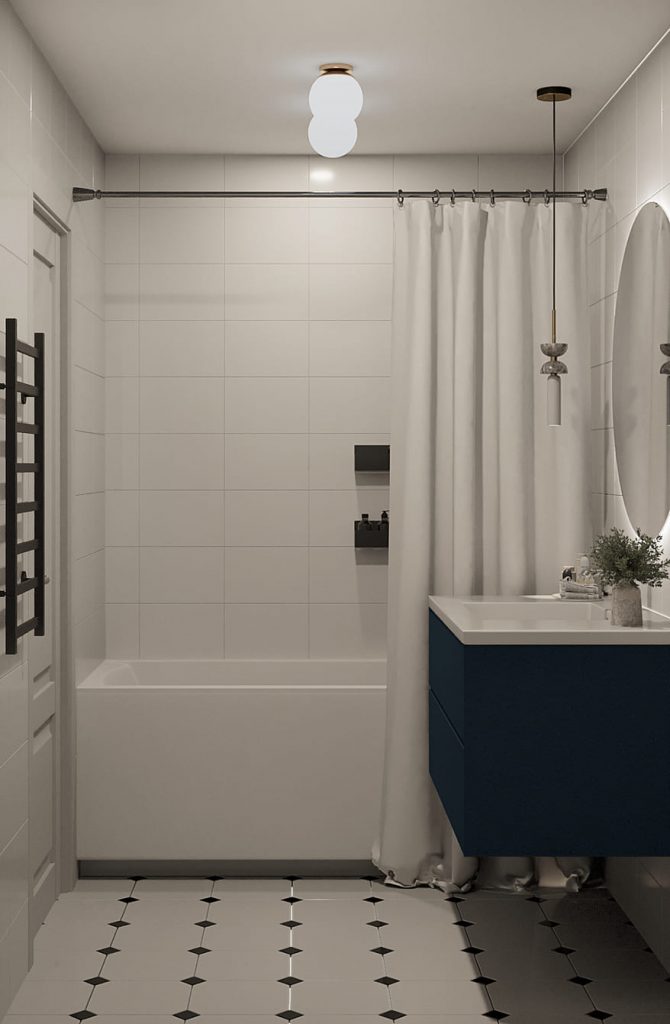 Минималистичная ванна с аккуратным душем и белой шторой не загромождает пространство. А открытые полки у зоны купания решают вопрос хранения без визуального шума. Чёрный полотенцесушитель, ручки, крепления и сантехника продолжают тему графичных акцентов.