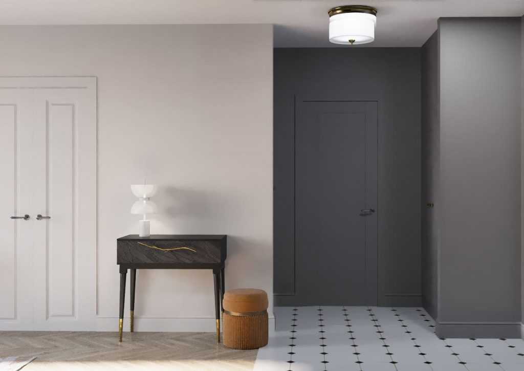 Прихожая оформлена в глубоком сером оттенке, который «собирает» пространство и задаёт тон всему проекту. Чтобы подчеркнуть геометрию и добавить утончённости, мы выбрали классическую плитку в чёрно-белой гамме — отсылка к парижским подъездам и кафешкам.