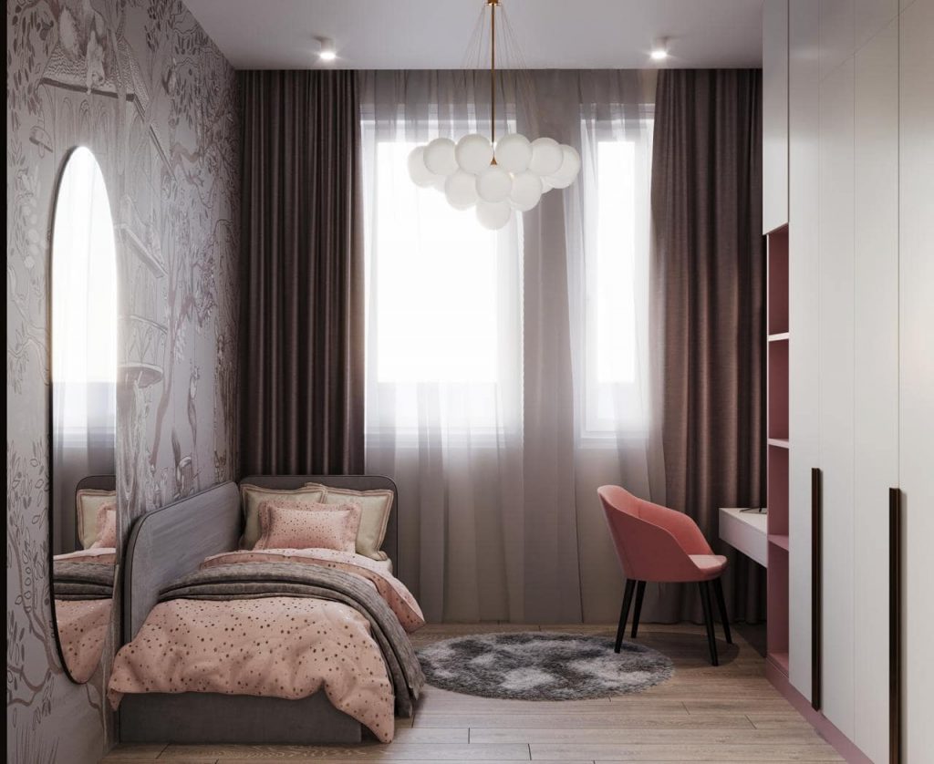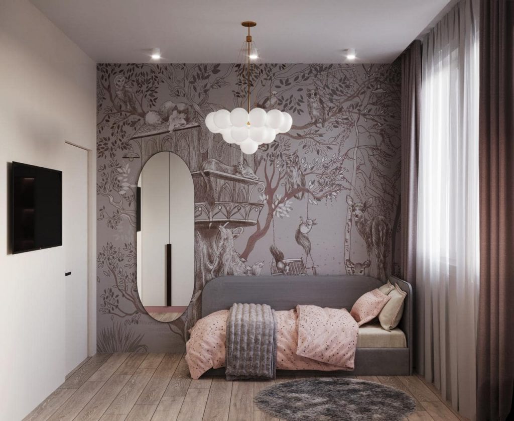 Главный визуальный акцент — сказочные обои с лесными животными, которые вдохновляют на игру и фантазии. Место для сна оформлено комфортной кроватью с текстилем в приглушенной розовой гамме и мягким покрывалом.