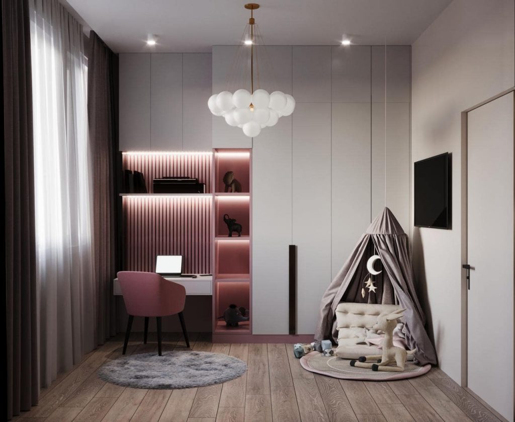 Рядом — рабочая зона с компактным столом и встроенными стеллажами с декоративной подсветкой. А уютный уголок с текстильным шатром, подушками и игрушками — идеальное место для отдыха, чтения или уединённой игры.