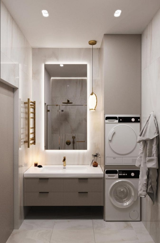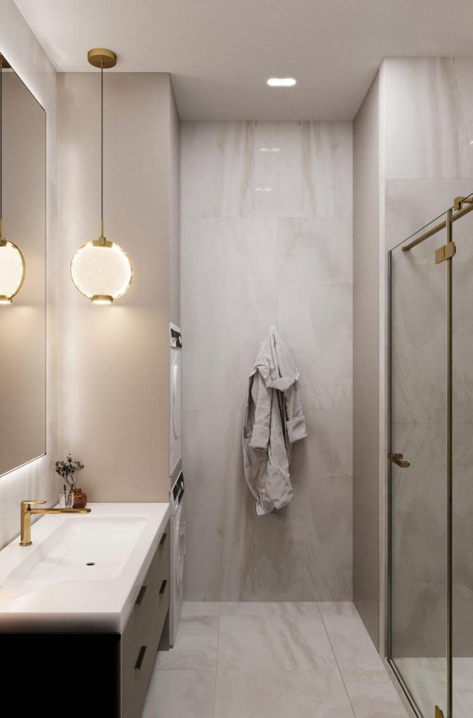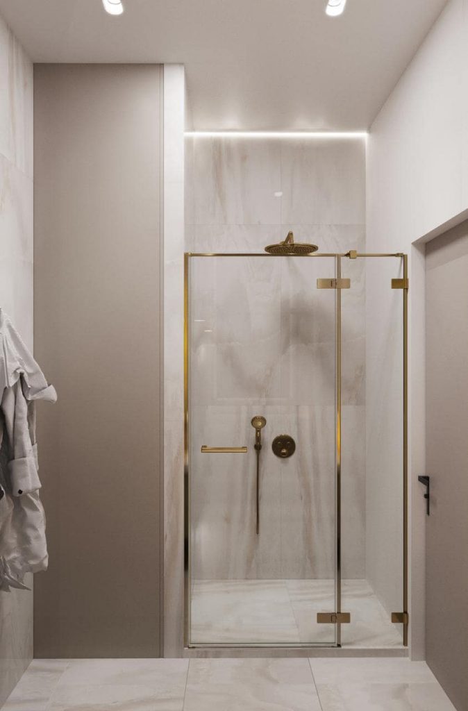 Душевая зона оформлена стеклянными перегородками с золотистой фурнитурой и встроенным верхним душем. Удачно интегрирован блок со стиральной и сушильной машинами — решение, которое делает ванную не только стильной, но и функциональной.