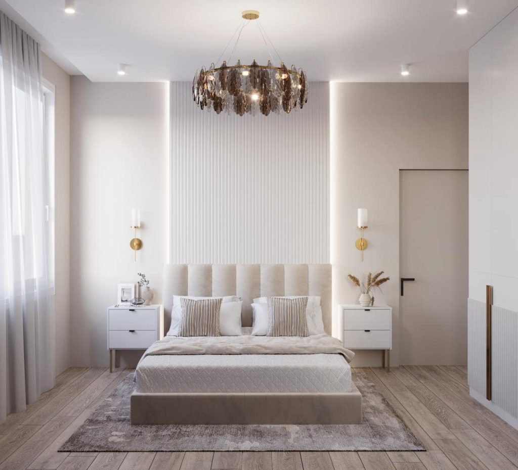 Светлая цветовая палитра с бежевыми и кремовыми оттенками создаёт мягкую, расслабляющую атмосферу. В центре композиции — кровать с объемным изголовьем, оформленным в благородной текстуре, подчёркнутая тонкой подсветкой и вертикальными панелями за спинкой.