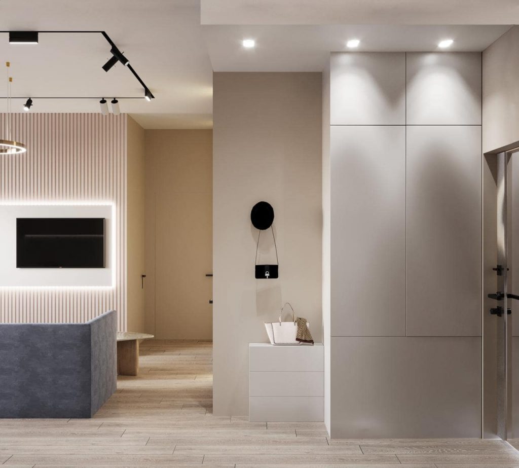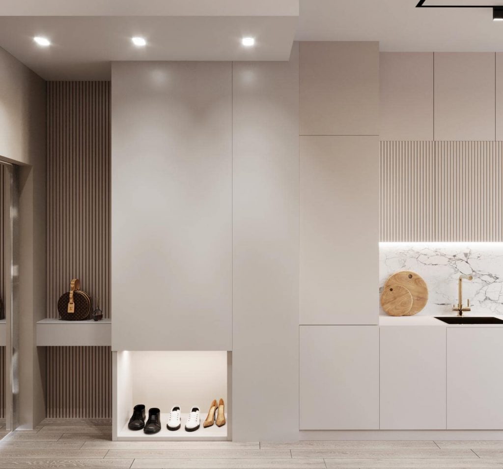 С первого взгляда прихожая задаёт тон всей квартире — она светлая, лаконичная и продуманная до мелочей. Здесь нет ничего лишнего, но при этом всё под рукой. Встроенные шкафы с гладкими фасадами в тёплом кремовом оттенке скрывают систему хранения, а открытая ниша с подсветкой — удобное решение для повседневной обуви.