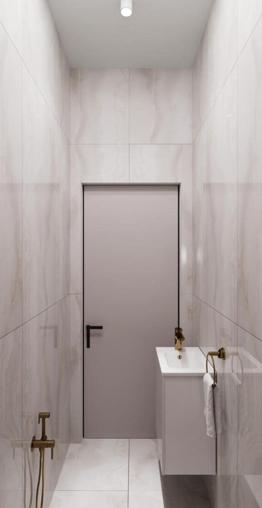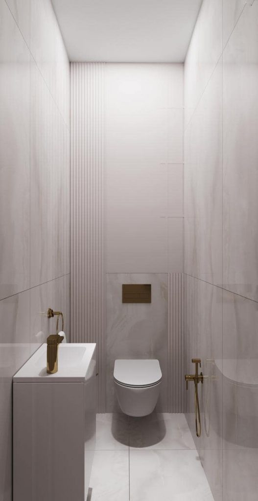 Гостевой санузел оформлен в светлой мраморной палитре, которая визуально расширяет пространство и придаёт ему лёгкость. Миниатюрная подвесная тумба с раковиной максимально компактна и удобна, а золотая сантехника и аксессуары делают интерьер изысканным и благородным. Стена за унитазом дополнена вертикальными рейками, которые добавляют текстуру и акцент, не перегружая общую композицию.
