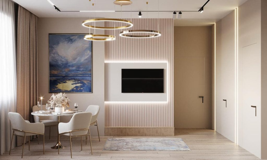 Фоновые вертикальные рейки из натурального дерева визуально вытягивают пространство вверх, добавляя ритм и мягкую текстуру. Золотые акценты появляются деликатно — в фурнитуре и декоре, придавая пространству лёгкий налёт роскоши. Уют создают и тёплый оттенок стен, и мягкий свет встроенных светильников.