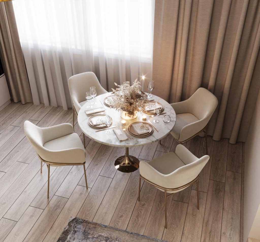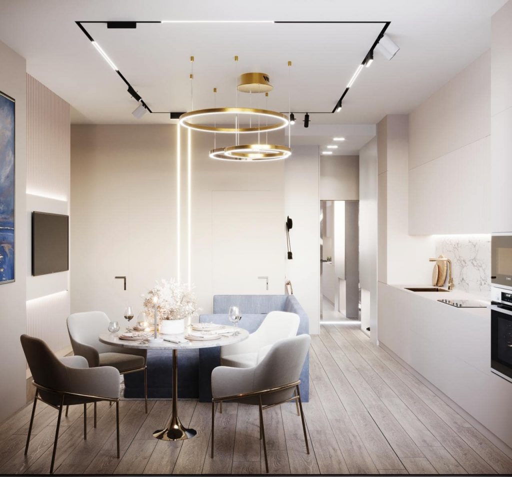 Объединённое пространство кухни и гостиной стало уютным и элегантным центром квартиры. Светлая палитра, мягкие кремовые оттенки и акценты тёплого золота создают атмосферу тепла и лёгкости.