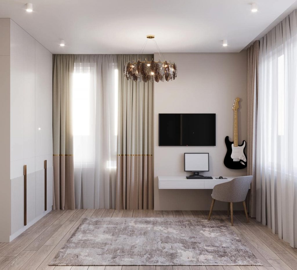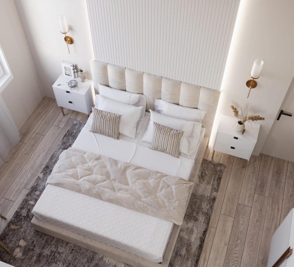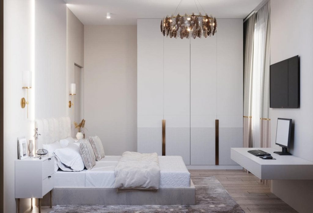 С каждой стороны кровати — прикроватные тумбы и бра с золотым основанием, создающие симметрию и уютный вечерний свет. Рабочая зона у окна оформлена минималистично, с подвесной столешницей и лёгким креслом — идеальное место для фокусировки или хобби.