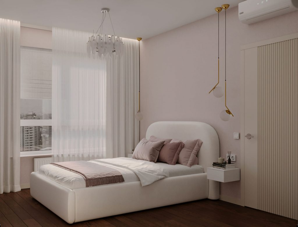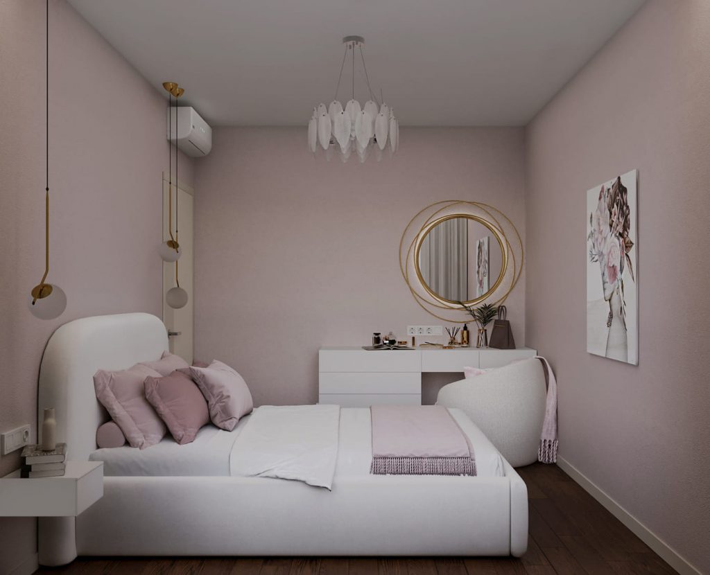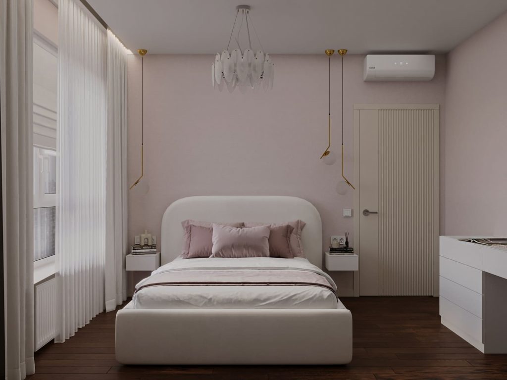 Пространство оформлено в приглушенных розово-пудровых оттенках, которые создают атмосферу уюта, покоя и лёгкой романтики — идеальное место для восстановления после активного дня.