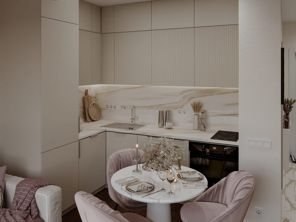 Светлая кухонная зона — с фасадами без ручек и рифлёной отделкой — лаконична и элегантна. Фартук и столешница с имитацией мрамора добавляют роскоши, но без вычурности. Подсветка под шкафами создаёт дополнительный сценарий освещения — идеальный для вечернего приготовления ужина или уютного чаепития.