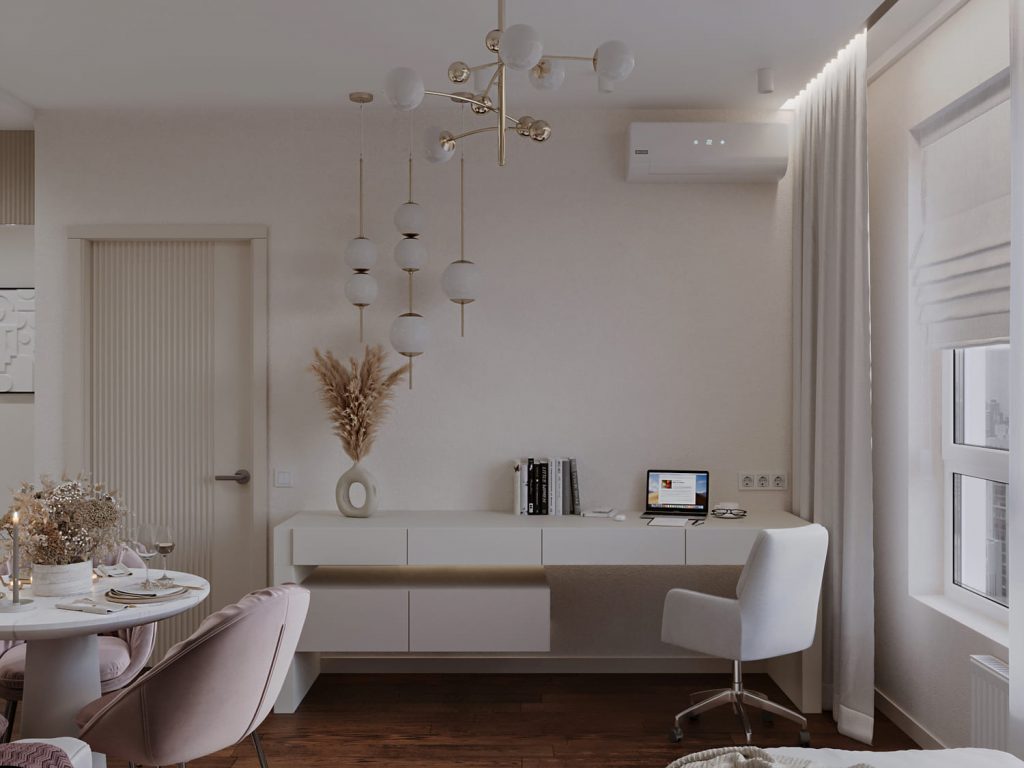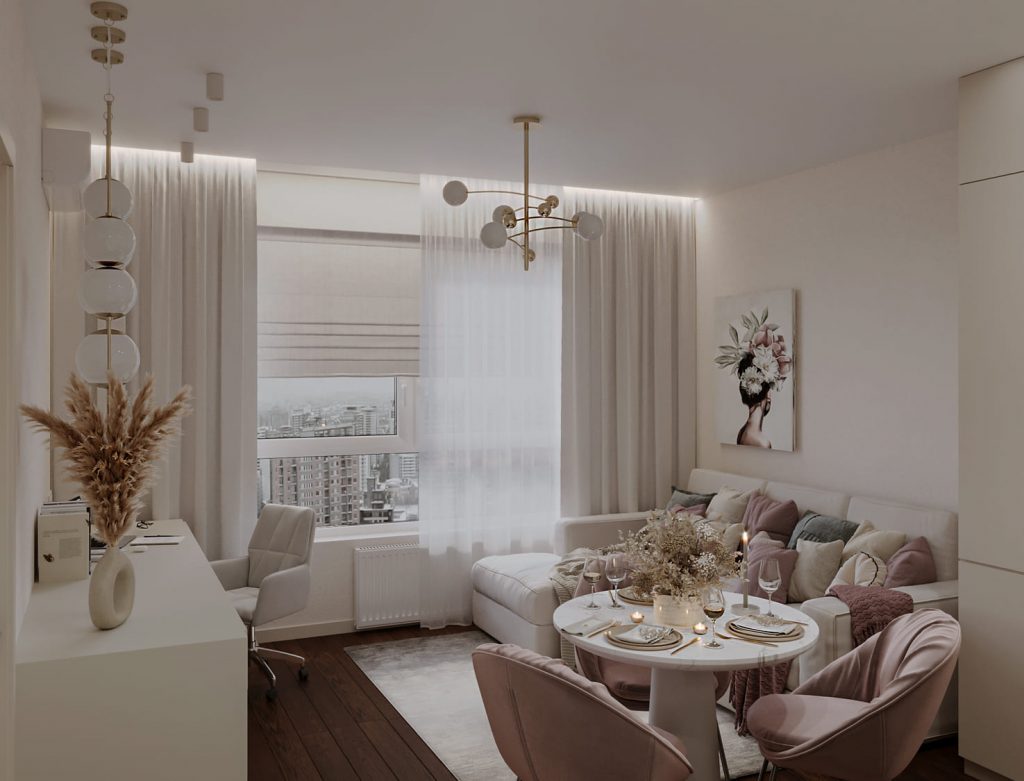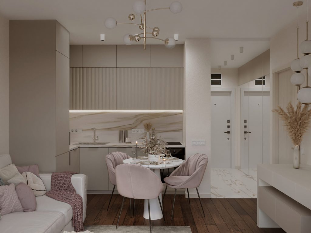 В основе интерьера — светлая нейтральная палитра, дополненная мягкими розовыми и пудровыми акцентами. Такие тона не только визуально расширяют пространство, но и создают лёгкое, расслабляющее настроение. Фактурные материалы, текстиль, нежная подсветка и округлые формы мебели делают обстановку по-домашнему уютной, но при этом актуальной и стильной.