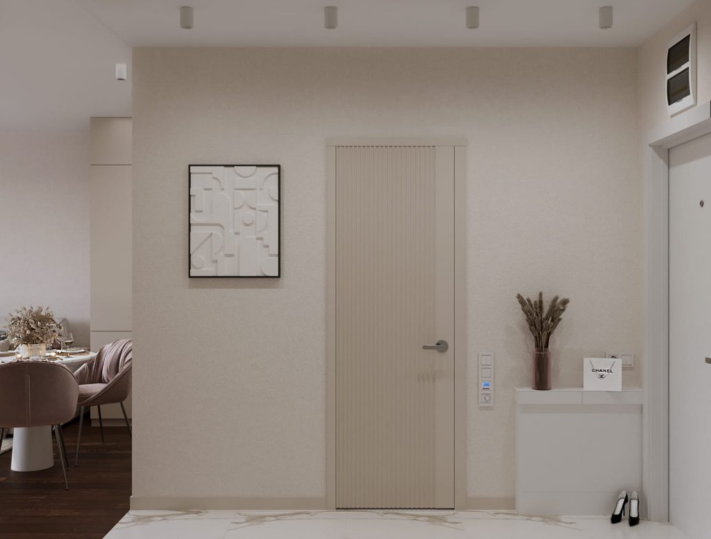 Прихожая выполнена в современной стилистике с акцентом на женственность и чистоту линий. Стены и двери оформлены в нежных, теплых оттенках бежевого, что визуально расширяет пространство и создаёт спокойное настроение с порога.