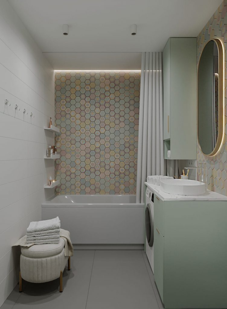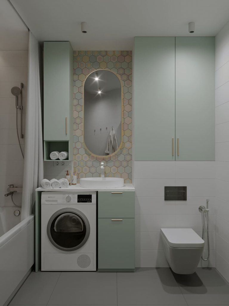 Нежная мятная палитра фасадов в сочетании с геометричной плиткой в пастельных тонах придаёт интерьеру свежести и индивидуальности. Здесь нет места скуке — даже рутинные утренние сборы превращаются в эстетическое удовольствие.