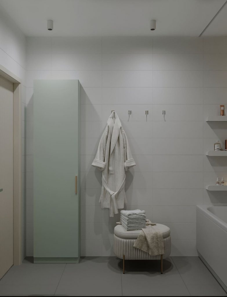 Функциональность тоже на высоте: стиральная машина встроена в мебельный модуль, здесь же — умывальник, места для хранения и полочки для мелочей. Уютная банкетка с мягкой обивкой добавляет ощущения спа-зоны, а встроенное освещение и точечные светильники создают мягкий, рассеянный свет.
