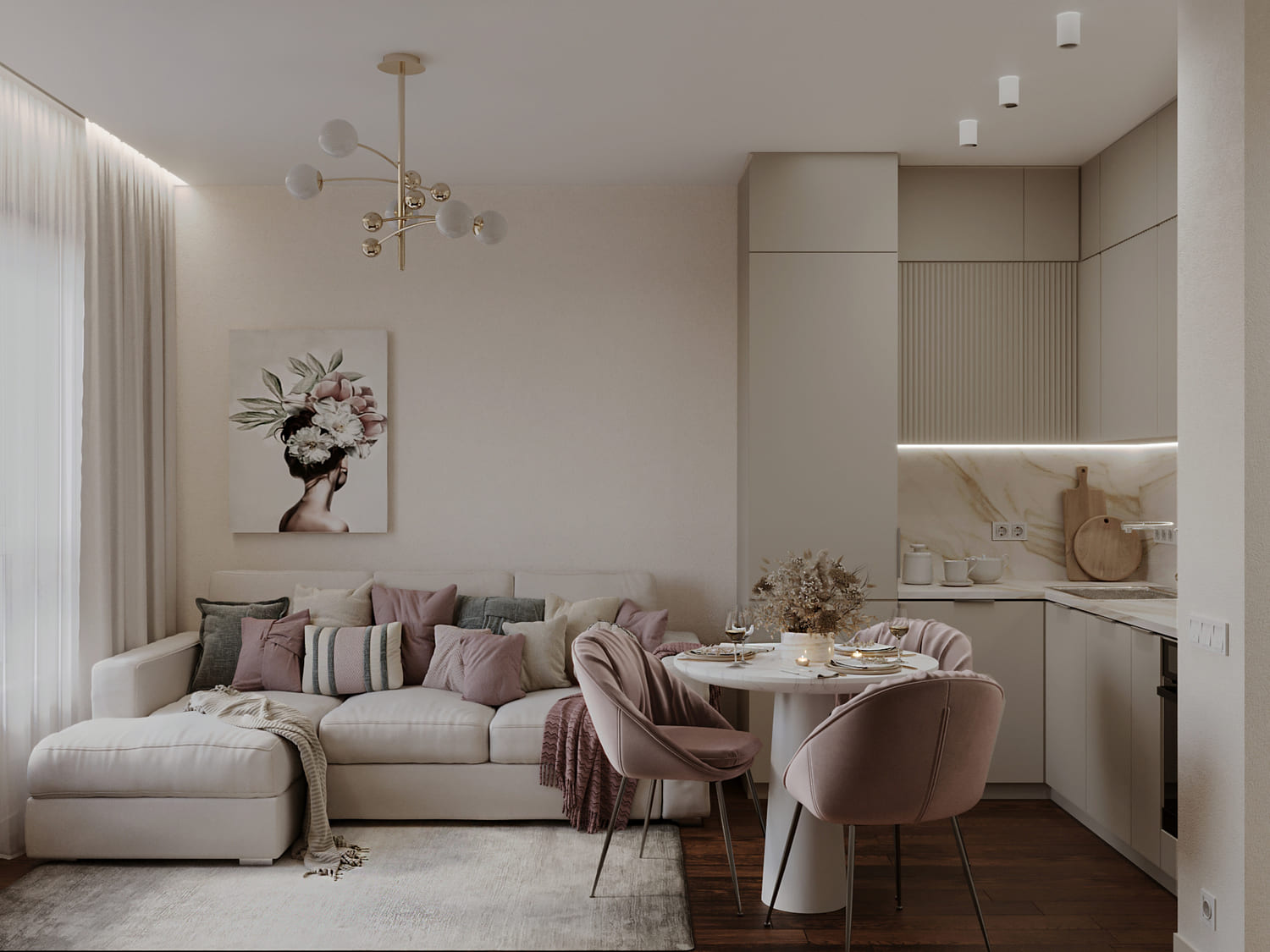 В основе интерьера — светлая нейтральная палитра, дополненная мягкими розовыми и пудровыми акцентами. Такие тона не только визуально расширяют пространство, но и создают лёгкое, расслабляющее настроение. Фактурные материалы, текстиль, нежная подсветка и округлые формы мебели делают обстановку по-домашнему уютной, но при этом актуальной и стильной.