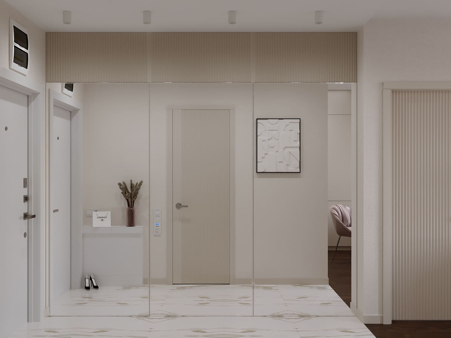Прихожая выполнена в современной стилистике с акцентом на женственность и чистоту линий. Стены и двери оформлены в нежных, теплых оттенках бежевого, что визуально расширяет пространство и создаёт спокойное настроение с порога.