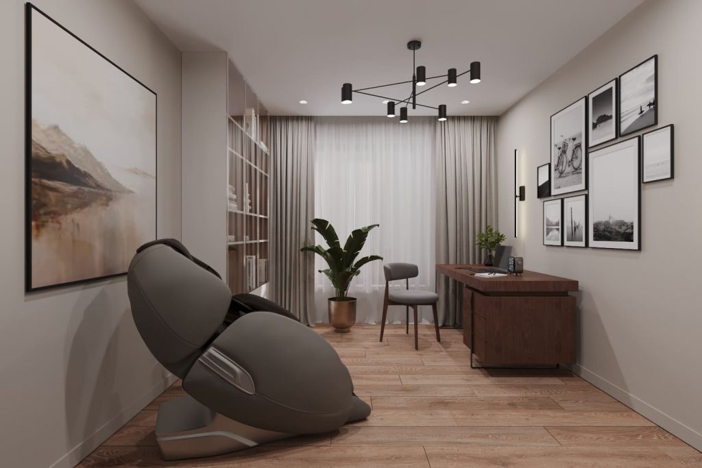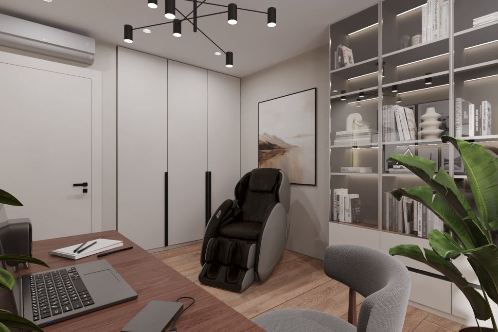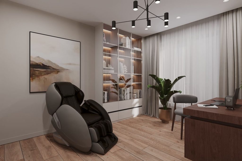 Для мужа, ценящего спокойствие и уединение для продуктивной работы, мы создали кабинет в сдержанных тонах. Просторное рабочее место с эргономичным столом и удобным креслом обеспечивает комфорт для длительной работы. Настенные бра с направленным светом минимизируют тени и снижают утомляемость глаз. Персональные элементы декора придают кабинету индивидуальность, превращая его в пространство для творчества и концентрации. Встроенный стеллаж с остеклёнными дверцами служит для хранения книг и документов, сохраняя визуальную лёгкость пространства. Зона отдыха с массажным креслом позволяет расслабиться между рабочими задачами.