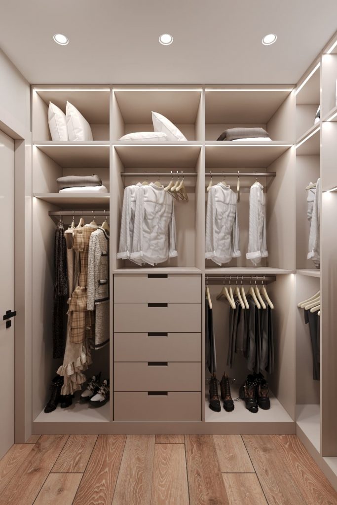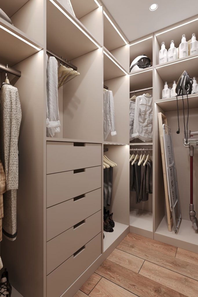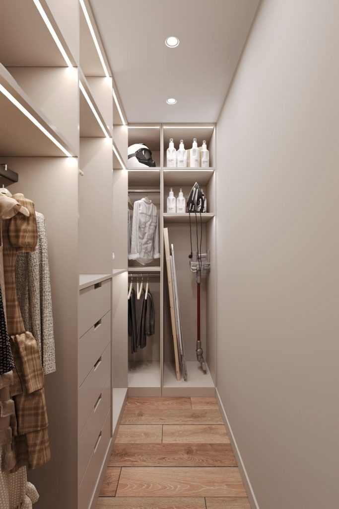 Понимая важность продуманной системы хранения, мы создали функциональную гардеробную при входе. П-образная компоновка эффективно использует пространство, обеспечивая удобный доступ к вещам. Комбинация открытых полок и закрытых секций позволяет скрыть сезонную одежду и поддерживать порядок. Встроенная светодиодная подсветка облегчает поиск нужных предметов и создаёт приятную атмосферу. Светлые матовые фасады придают гардеробной элегантность, а использование материалов, устойчивых к влаге и царапинам, гарантирует долговечность и сохранение внешнего вида мебели.