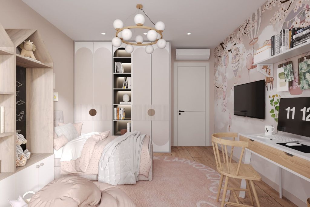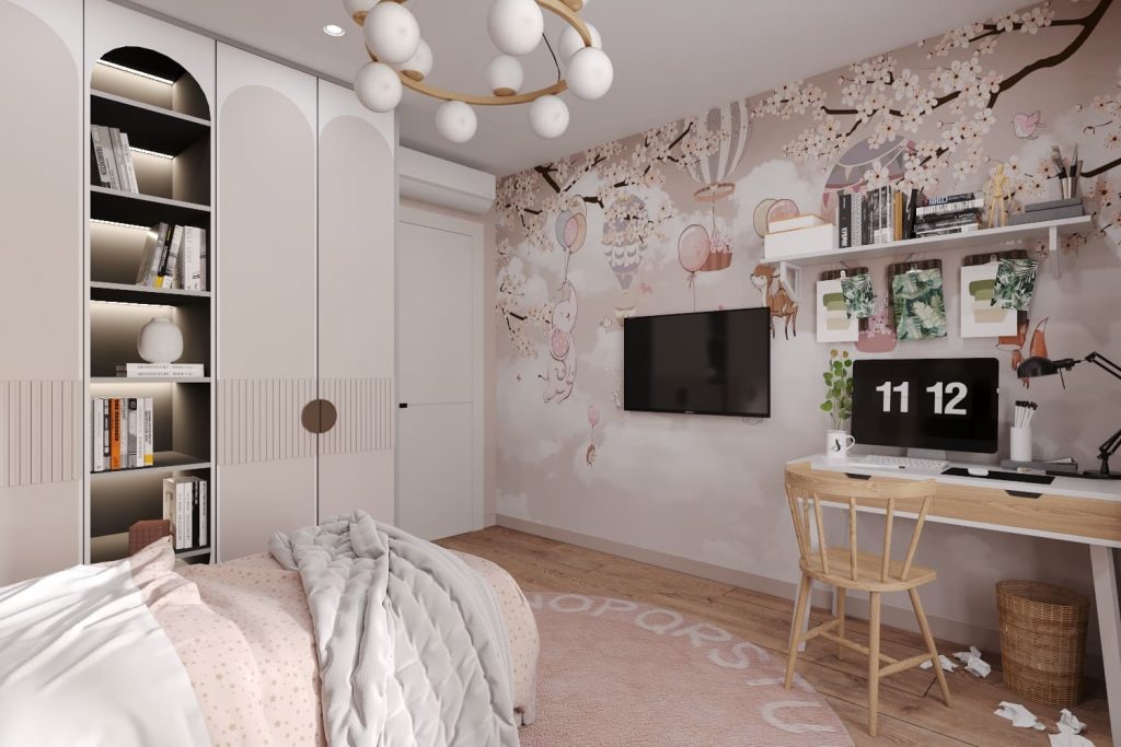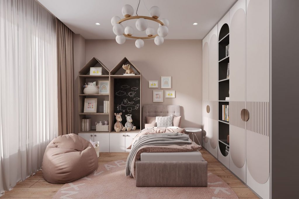 Отразив мир глазами ребёнка, мы создали яркую и весёлую детскую комнату. Стеллажи в виде домиков с доской для рисования мелом стимулируют развитие творчества у девочки. Мебель с округлыми формами и безопасными материалами обеспечивает комфорт и безопасность. Яркие акценты и обои с весёлым принтом делают пространство живым и увлекательным, стимулируя любознательность.