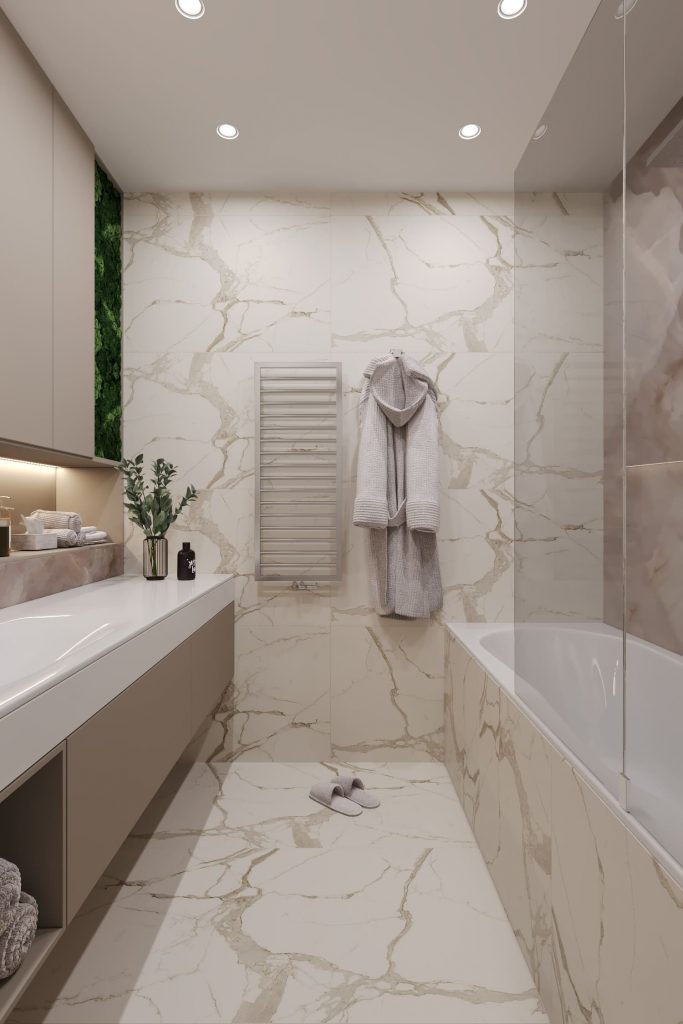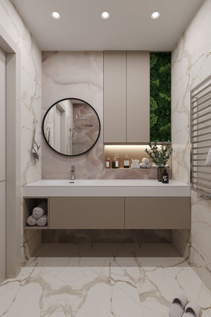 Плитка с мраморной текстурой на стенах и полу создаёт ощущение роскоши и защищает от влаги. Подсветка в зоне зеркала обеспечивает комфортное освещение для ежедневных процедур. Также дизайнер Domeo предложил добавить и здесь растительные акценты в виде стабилизированного мха в нишах, для свежести и природной гармонии.
