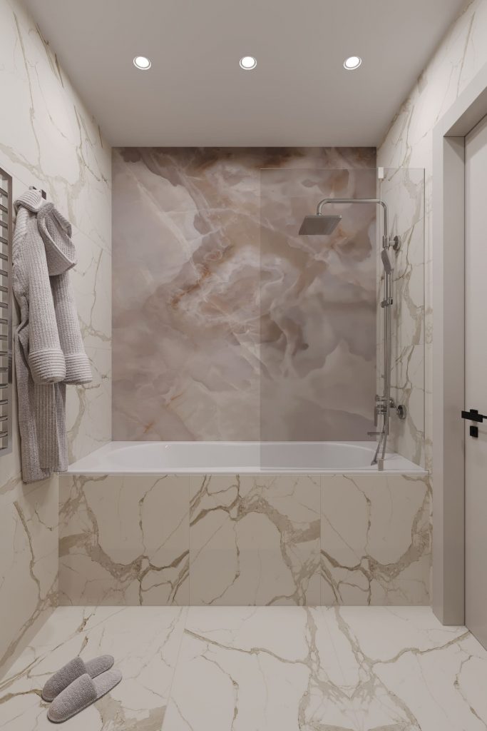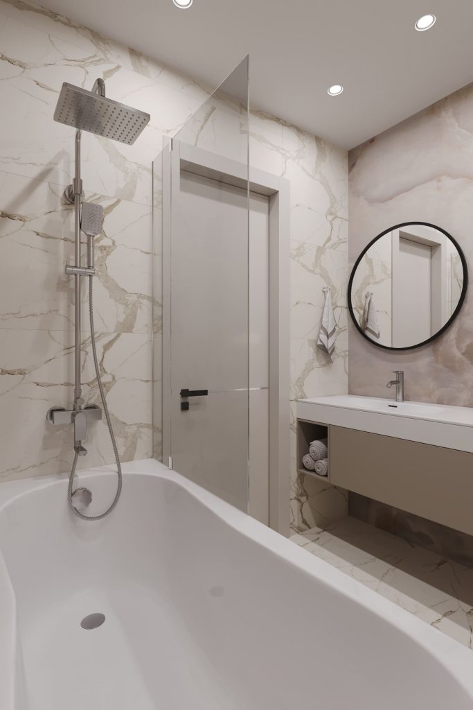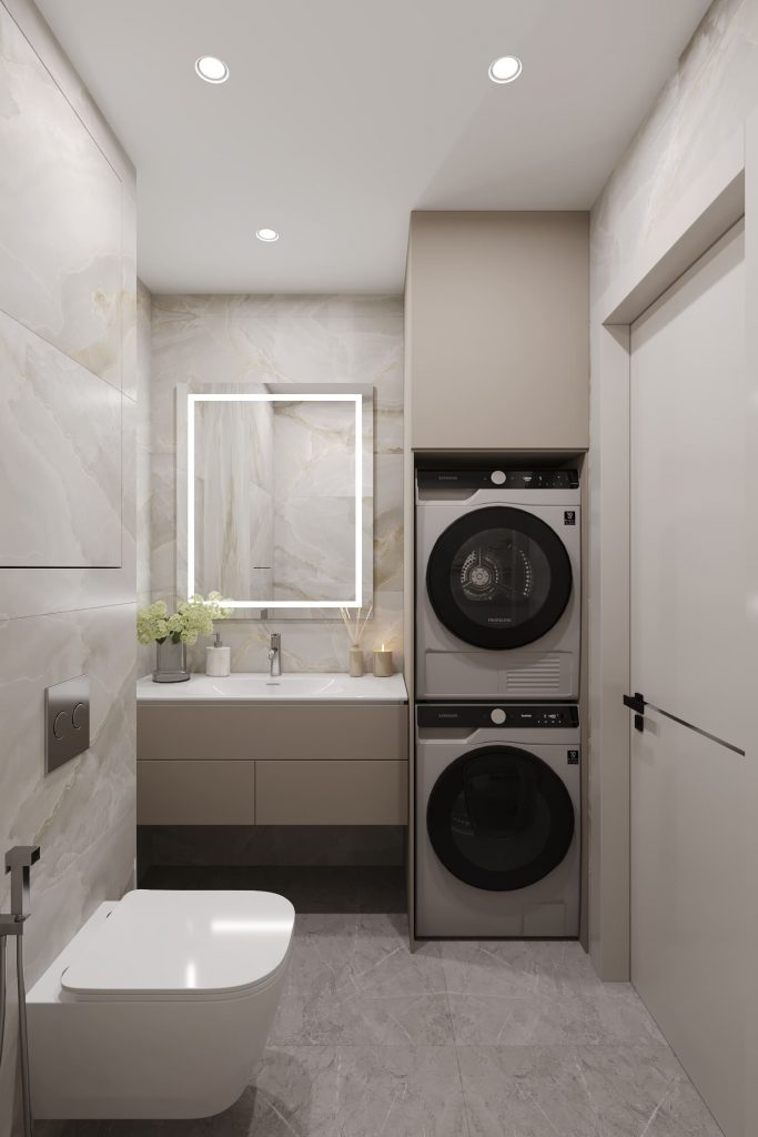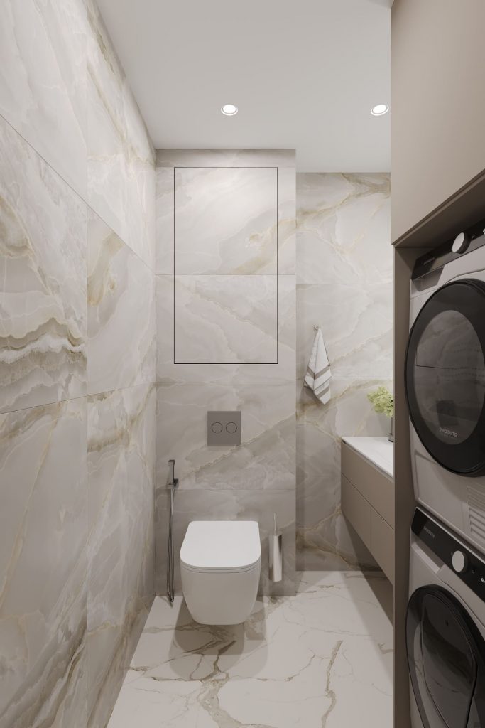 Санузел спроектирован с максимальной эффективностью использования пространства. Компактная установка стиральной и сушильной машин в колонну освобождает место, оставляя достаточно пространства для хранения и передвижения. Унитаз с инсталляцией скрыт в нише, упрощая уборку и обеспечивая компактность. Светлая палитра и плитка с мраморной текстурой визуально увеличивают помещение, делая его светлым и просторным. Подсветка вокруг зеркала и стеклянная перегородка в душе создают ощущение открытости.