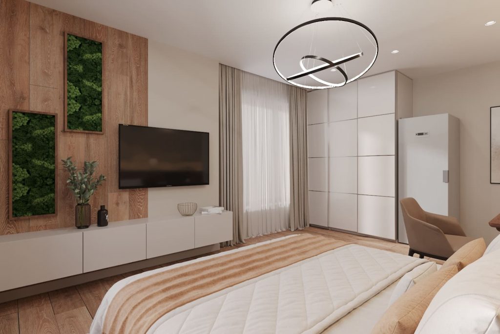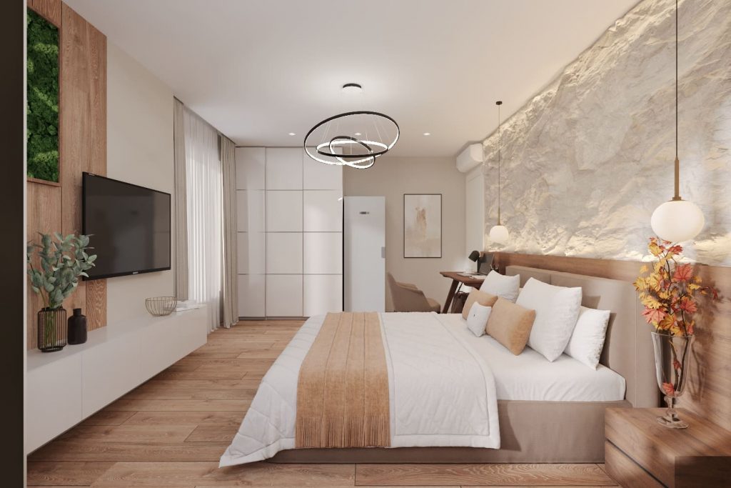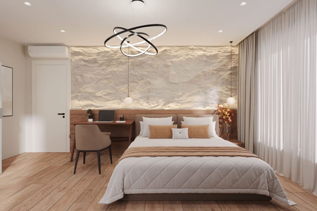 Спальня стала оазисом гармонии и спокойствия, объединяя современные элементы и скандинавский стиль. Центральным элементом является кровать с мягким изголовьем и декоративными панелями, имитирующими поверхность камня. Декоративная подсветка изголовья создаёт расслабляющую атмосферу.