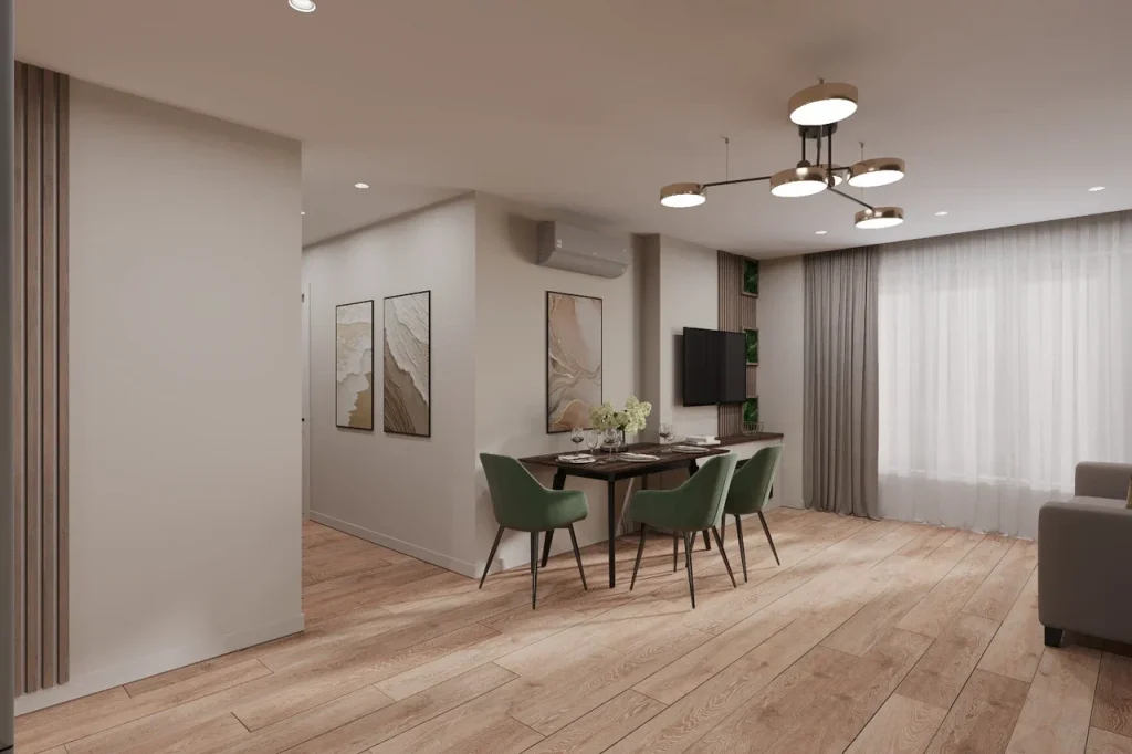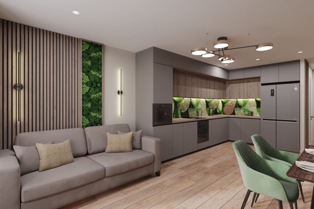 Кухня оснащена по последнему слову техники, а рабочая зона спроектирована для максимального удобства. Фартук из глянцевого стекла с зелёным акцентом привносит свежесть и энергию. Кухонный стол из натурального дерева служит функциональным разделителем и любимым местом для утреннего кофе. В гостиной биокамин и элементы со стабилизированным мхом добавляют природные нотки, создавая уютную атмосферу для семейных встреч и отдыха.