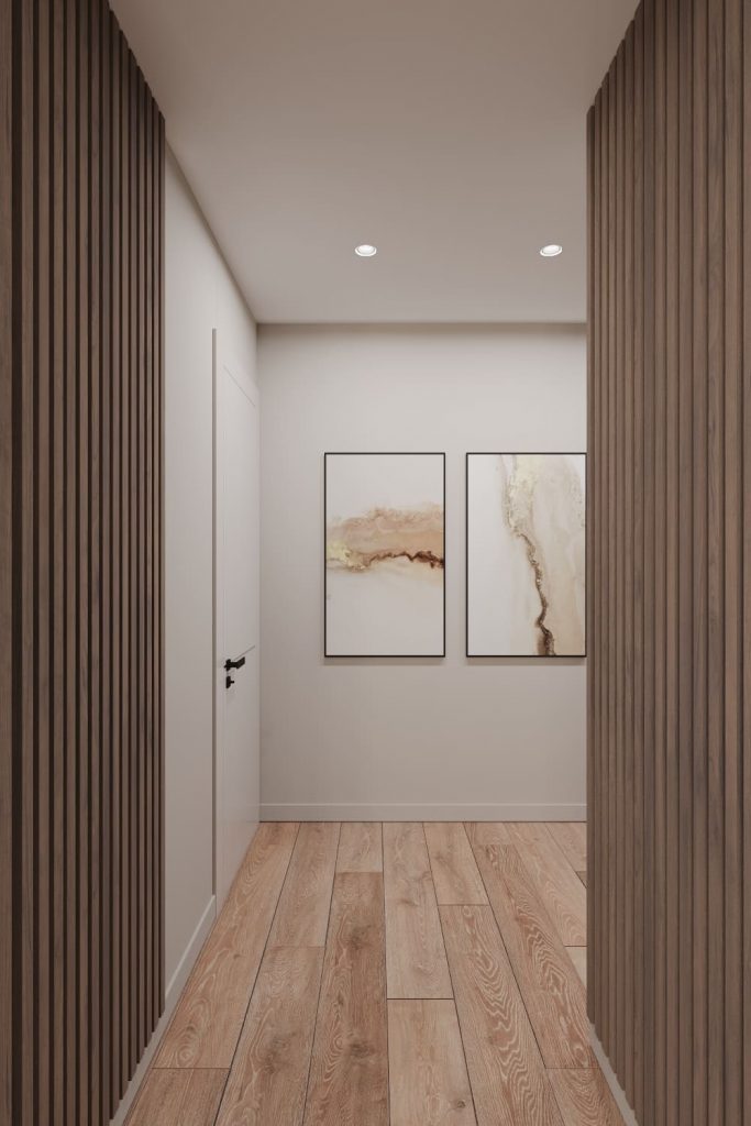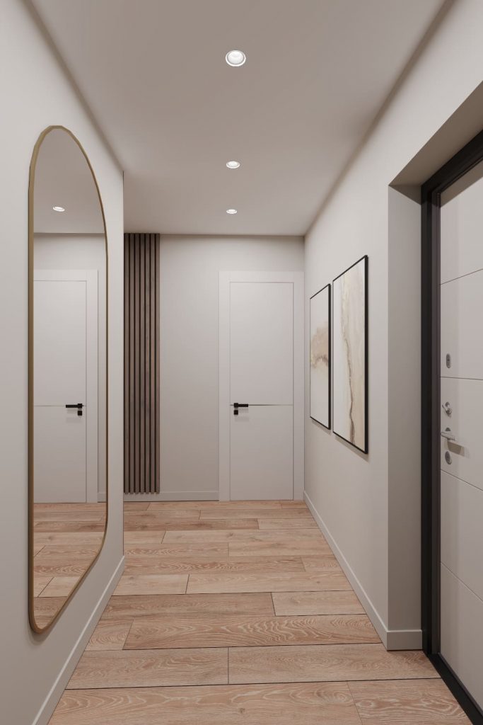 С первых шагов мы стремились создать ощущение тепла и уюта для молодой семьи с маленьким ребёнком. Встроенный шкаф с декоративными рейками элегантно скрывает верхнюю одежду и придаёт прихожей современный стиль. Рейки из натурального дерева добавляют природную гармонию и тепло. Мягкий пуф с износостойкой обивкой обеспечивает комфорт при переобувании, что особенно важно для семьи с ребёнком. Просторная и светлая прихожая с зеркалом в полный рост визуально расширяет пространство и позволяет свободно перемещаться всей квартире.