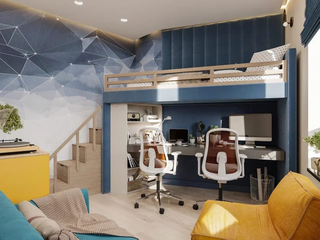 Абстрактные и контрастные формы царят в этой комнате. Голубой и синий с ярким желтковый желтым цветом сочетаются на нейтральном бежевом фоне и добавляют веселья и динамики. В небольшой комнате удалось разместить и уютное и просторное спальное место и рабочее пространство и зону отдыха детей. Это удалось реализовать за счет двухъярусной мебели.