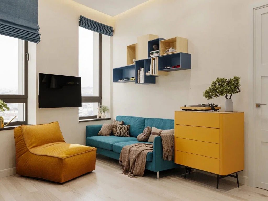 Квартира в современном стиле в светлых тонах с зелеными и синими акцентами