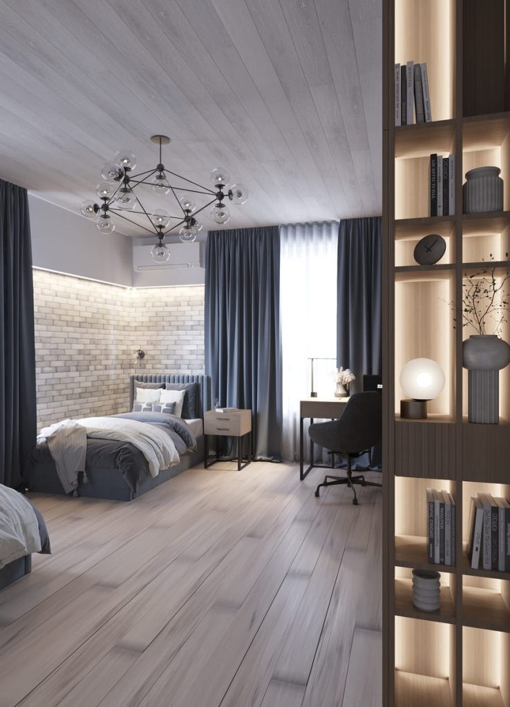 Освещение проработано детально: помимо центральной люстры, в каждой спальной зоне — отдельные лампы для чтения, а по периметру кирпичной кладки встроена мягкая подсветка.