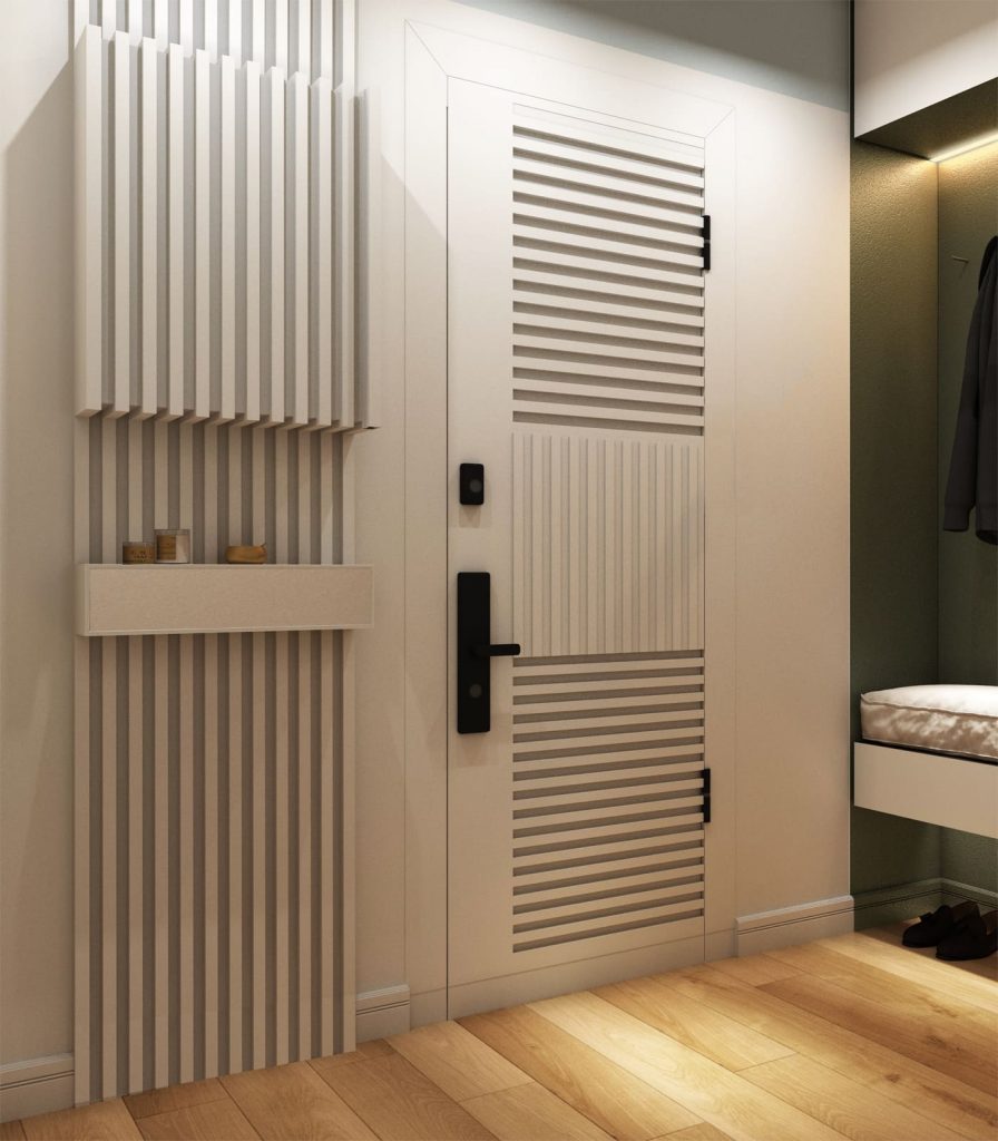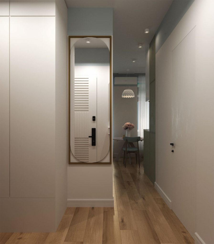 Компактная и узкая прихожая-коридор организована по максимуму эргономично. Так, над открытой обувницей, устроенной прямо на полу - встроенное сиденье (на которое положена мягкая сидушка), а над ним - открытая вешалка с крючками. Потому как всё помещение и мебель исполнены в светлых тонах, а стены ниши, в которой организованы обувница и вешалка - насыщенного оливкового оттенка, то зрительно прихожая-коридор кажется объемнее - как раз тут задействован приём акцентной окраски стен. С правой стороны от входной двери размещена узкая консоль для ключей, за которой - панель из реек, а над ней - выступ из таких же реек одного оттенка с окраской стен, благодаря чему создаётся интересный 3D эффект. На входной двери тоже размещены такие же рейки, только не в вертикальном, а в горизонтальном положении, что придаёт дополнительной динамики и оригинальности интерьеру. Ещё в прихожей размещён встроенный гардеробный шкаф (до потолка) напротив входной двери и ростовое зеркало сразу за ним, что очень удобно, когда собираешься на работу или по делам.