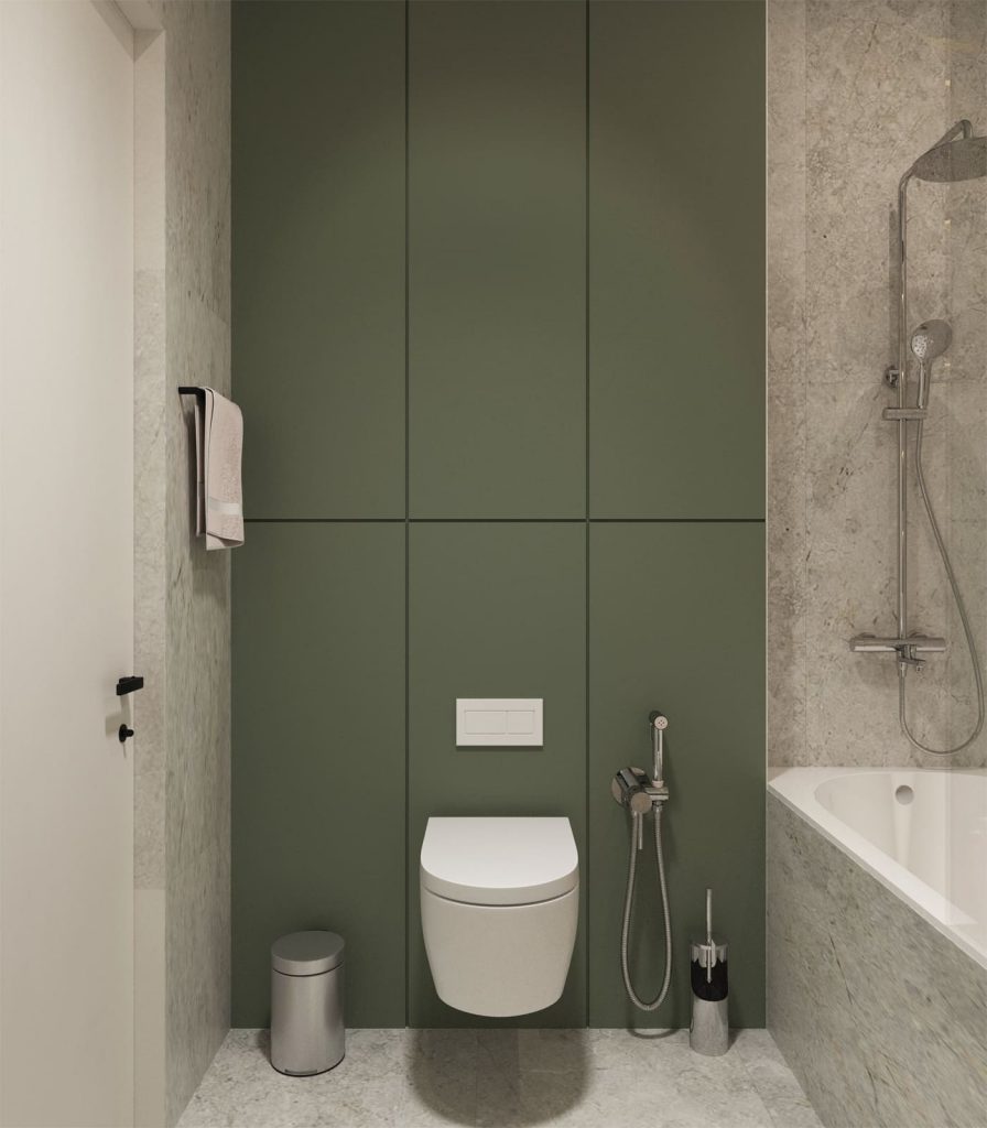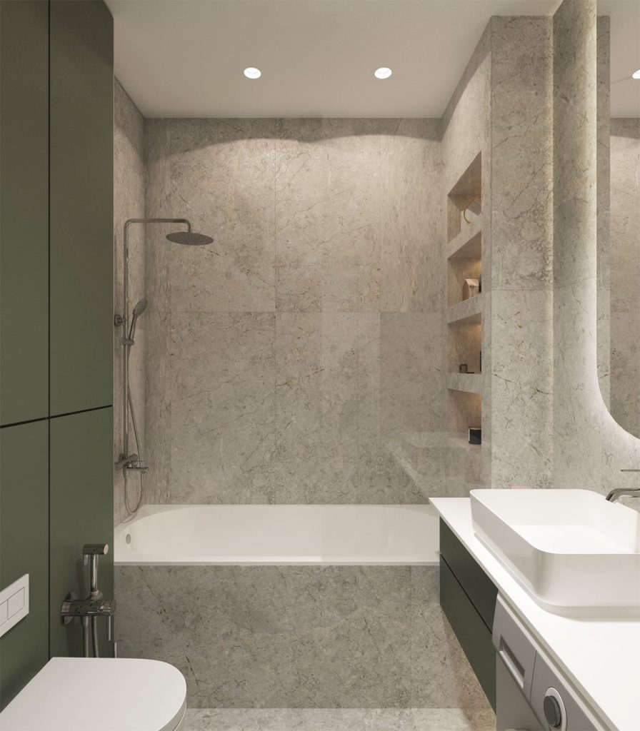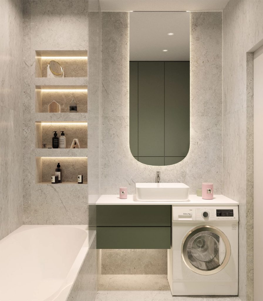 Уютнее и просторнее визуально комнату делает подсветка зеркала и полок-ниш над ванной, а стильности ему придаёт выделенные оливковым акцентным цветом зона инсталляции за унитазом и отделка выдвижных ящиков подвесной тумбы.