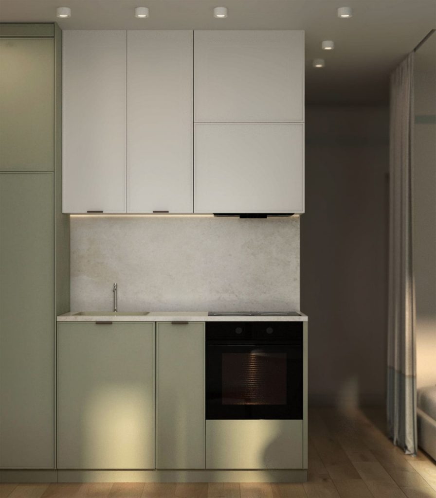 Дизайн-проект этой квартиры-студии составлялся для молодой девушки. Первая основная задача, которая стояла перед нами, заключалась в том, чтобы сделать пространство пригодным для жизни, ввиду этого использовались оптимальные варианты и материалы. Вторая приоритетная задача - сделать небольшую квартиру визуально просторнее и светлее, решалась нами посредством добавления разного по сценарию освещения и еще был задействован прием акцентной окраски стен, чтобы зрительно увеличить пространство. Также, заказчица хотела, чтобы пространство кухни-гостиной было объединено со спальней. Цветовая гамма для оформления интерьера выбрана светлая с нежно-оливковыми акцентами, а стиль - современный. В итоге квартира получилась функциональной, стильной и нежной.