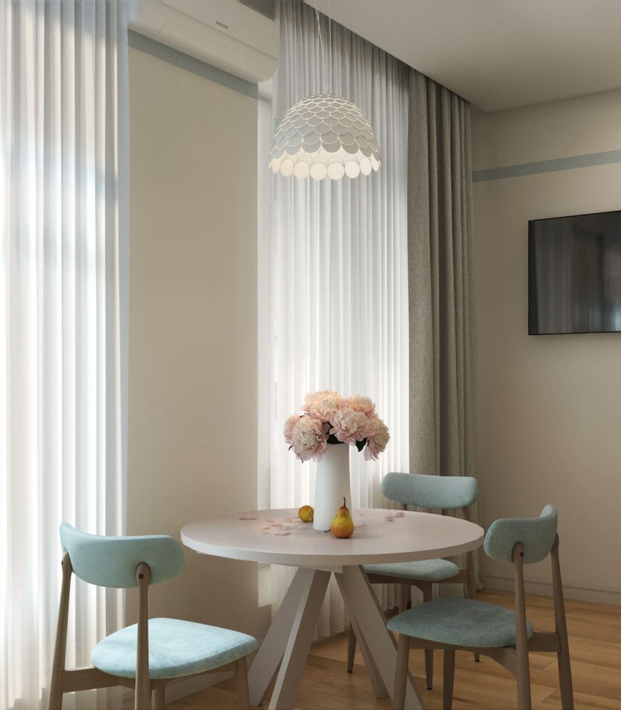 Вторая - эргономичная обеденная зона - включает круглый стол, приставленный к простенку между окнами, чтобы не занимать столь ценное свободное пространство, и три удобных оригинальных стула с нежно-голубой обивкой.