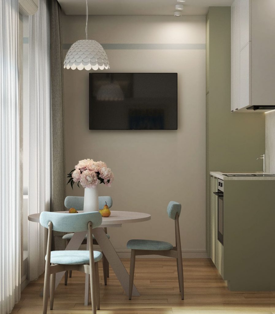 Также, в помещении имеется небольшая система хранения в виде антресольных шкафов (над диваном) с двухдверным отделением и с полками за стеклом с подсветкой, что добавляет глубины помещению и даже делает интерьер эксклюзивным и магнетическим вкупе с оригинальным винтажным панно под ним. А акцентные: светло-оливковая отделка кухни, обивка дивана вместе с нежно-голубой обивкой стульев, ажурной лампой-абажуром над обеденным столом, добавляют комнате женственности и уюта.