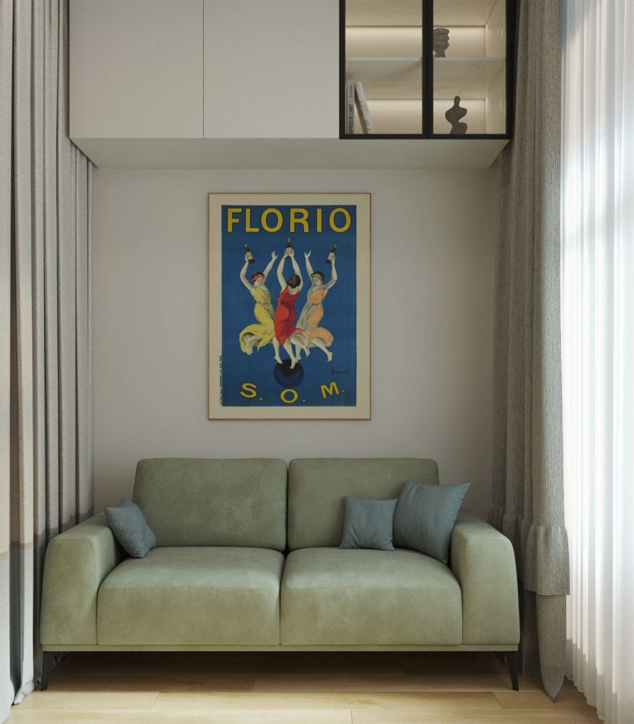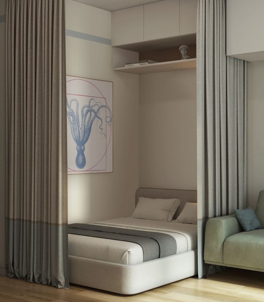 Зона отдыха - компактный стильный диван и ТВ панель на стене напротив без ТВ тумбы, чтобы в комнате было больше “воздуха”. Зона спальни - включает только большую кровать и три антресольных шкафа и открытую полку над ней для декоров и книг. Зона сна отгорожена от остального пространства вертикальными жалюзи, которые на ночь можно закрывать полностью, а днём - частично, чтобы комната казалась просторнее.