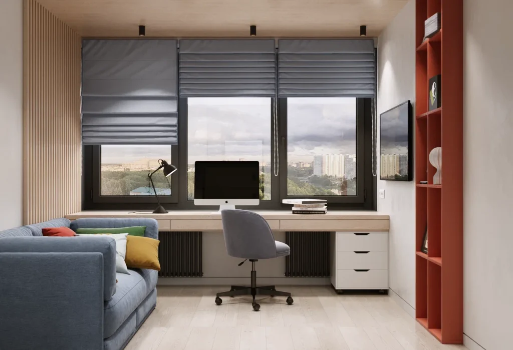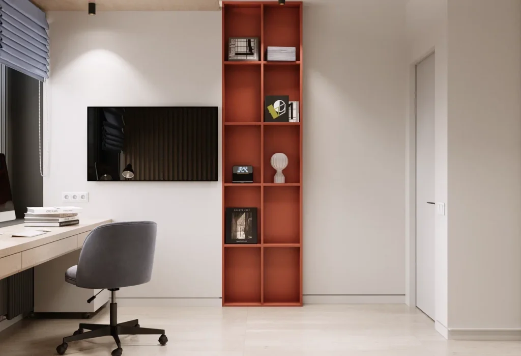 Мы добавили по просьбе заказчиков в детскую функциональный шкаф-стеллаж морковного оттенка, который является ярким акцентом и который можно использовать для хранения учебников, книг, сувениров, призов и много другого. Детская, как и остальные помещения квартиры - оптимально функциональна и эргономична - в ней только необходимый минимум мебели. Так, большой рабочий стол находится прямо перед окном во всю стену, что очень удобно - ничто не сковывает движения при выполнении уроков и освещение правильное (днем), под столом с правой стороны находятся выдвижные ящики, в которых можно хранить ручки, тетради и другие канцелярские принадлежности. К столу мы подобрали удобное мягкое компьютерное кресло.