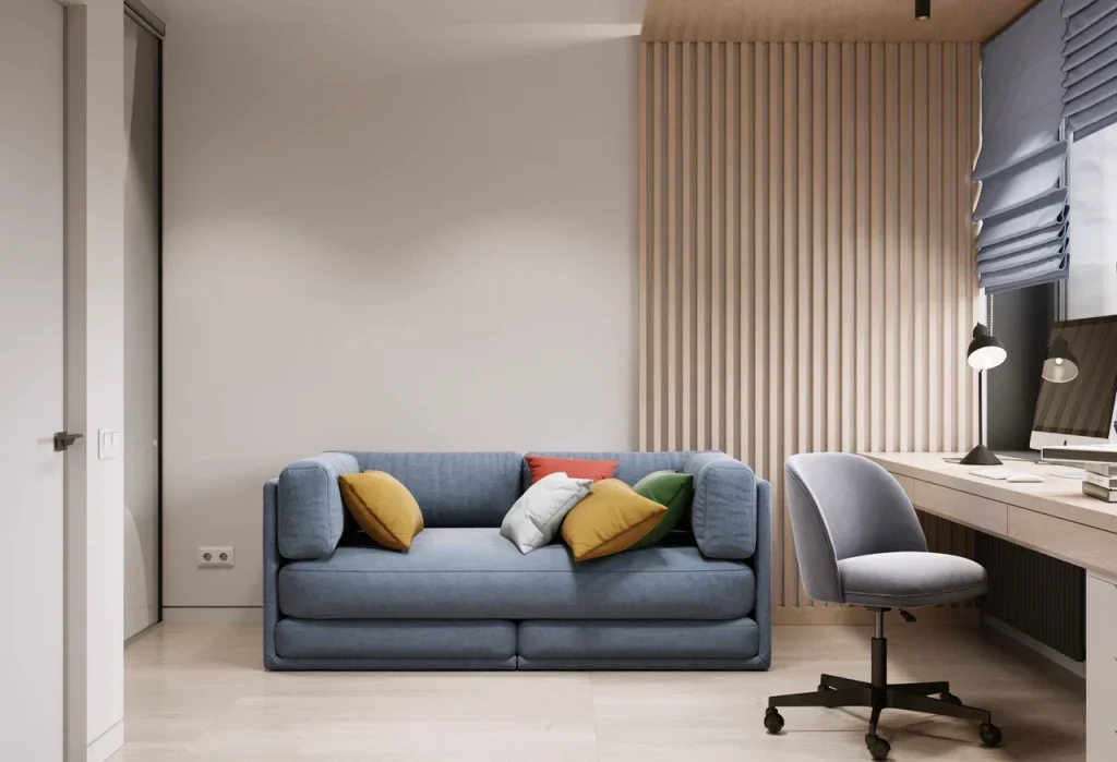 Условно мы разделили детскую на две части - зону кабинета и отдыха. Первая включает компьютерные стол и кресло, стеллаж, а вторая - компактный диван-кровать, который в дневное время собран, что экономит пространство, и ТВ панель на противоположной стене.