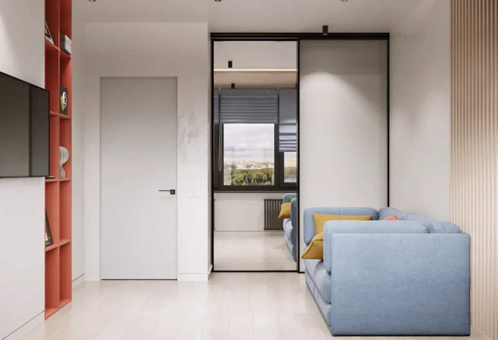Однокомнатная квартира для семьи из трёх человек, переделанная в просторную двушку, в современном стиле с акцентными цветами, с мини-прихожей, кухней-гостиной, мастер-спальней, детской и санузлом