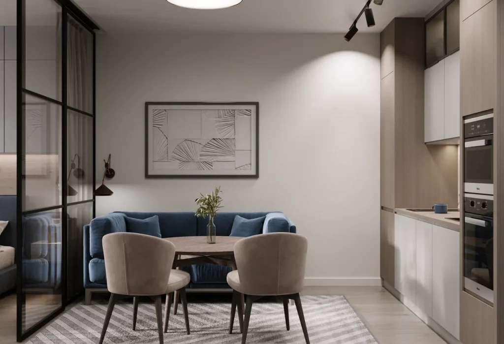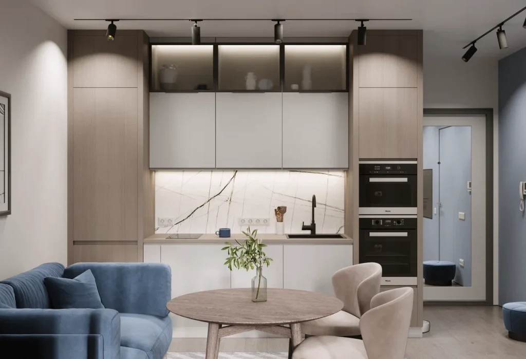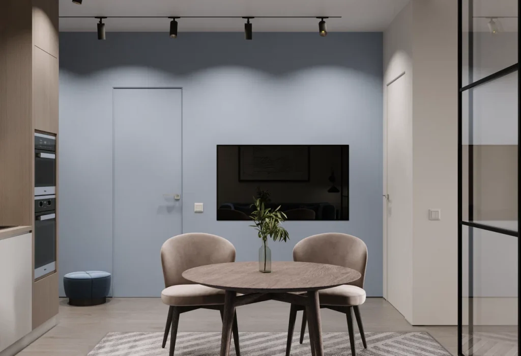 Зона гостиной кухни-прихожей представлена небольшим диваном небесно-голубого оттенка, компактным круглым столом бежевого цвета и всего двумя мягкими удобными стульями в тон столу напротив дивана, что отлично экономит пространство, а на противоположной акцентной небесно-голубой стене размещена ТВ панель без тумбы, так как вокруг нее - двери - в детскую и санузел.